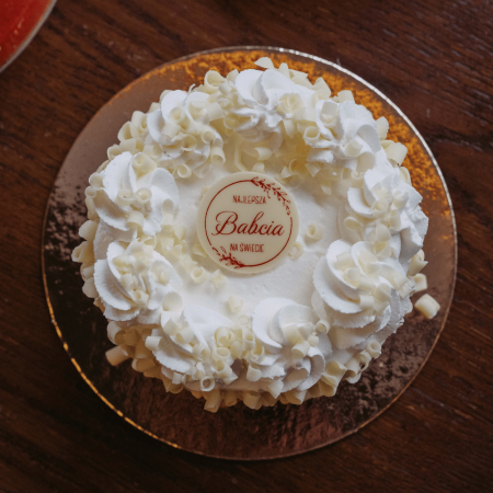 Tort dla Babci jest o smaku śmietanki w połączeniu z domową konfiturą malinową. O średnicy 16 cm. Około 4-6 porcji.
