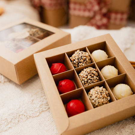 Zestaw obejmuje eleganckie opakowanie + 9 ręcznie robionych Pralin.
