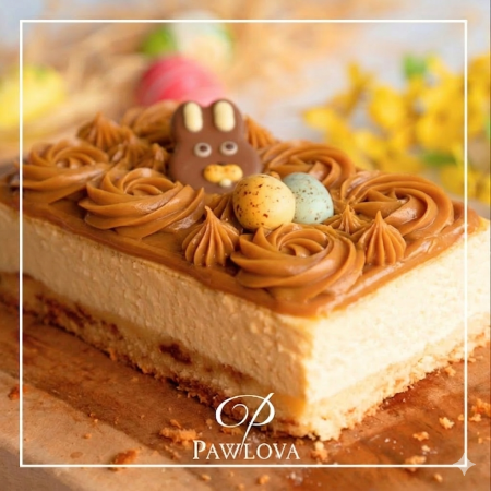Delikatny i subtelny sernik na bazie prawdziwego sera twarogowego z dodatkiem karmelu z waniliowym biszkoptem. W wersji wielkanocnej będzie w jednym, większym kawałku, a jego waga będzie oscylowała w granicach 500-600 gram (5-6 porcji)